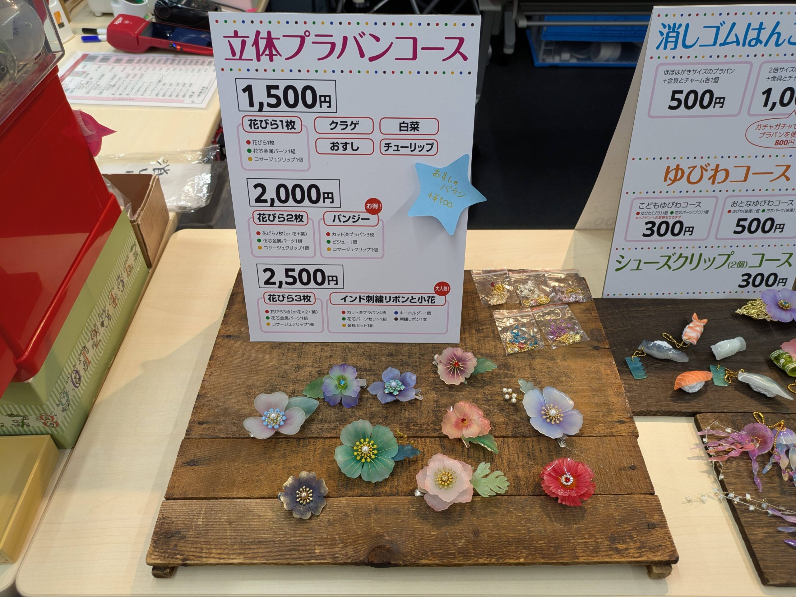 短い時間でも体験できる「かんたんコース」や、本格的な立体花プラバンに挑戦できる「お花コース」などをご用意して、作りたいものを選びながらご参加いただけます。
