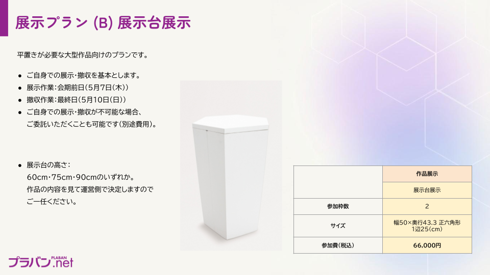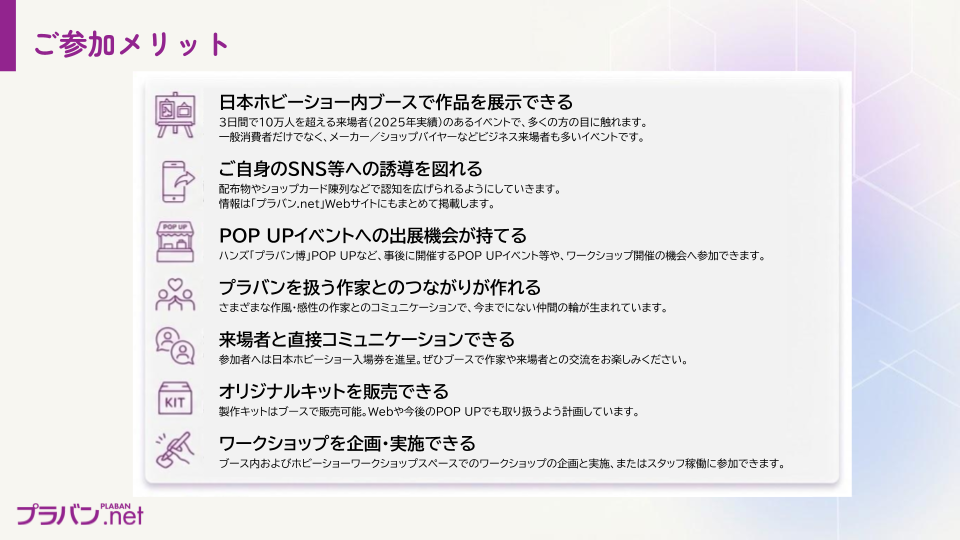 なお、日本ホビーショーでの展示後も、作品をそのままお預かりしてプラバン博関連のイベントで展示する可能性がありますのでご了承ください(別途ご相談)。