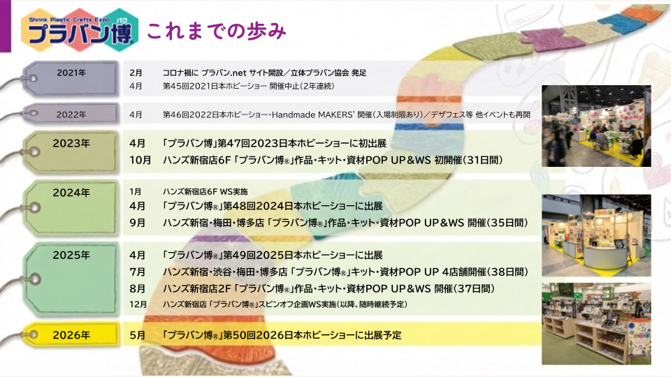 情報サイト「プラバン.net」とプラバンファンの集まり「立体プラバン協会」は、コロナ禍の2021年にスタートしました。その後、世の中にイベントの灯が本格的に戻った2023年に「プラバン博」として初めて日本ホビーショーにブース出展。そこからいろいろな企業様からお声掛けをいただく中、ハンズさん「文化の芽」企画との取り組みは毎年拡大して展開の機会をいただいています。