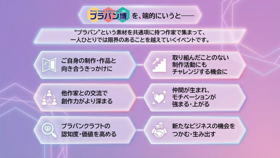 日本ホビーショーのテーマ「つくる、つづく、つながる」に合わせて、プラバンを使った作品を中心にして、あなたの作品の世界観を表現してください!