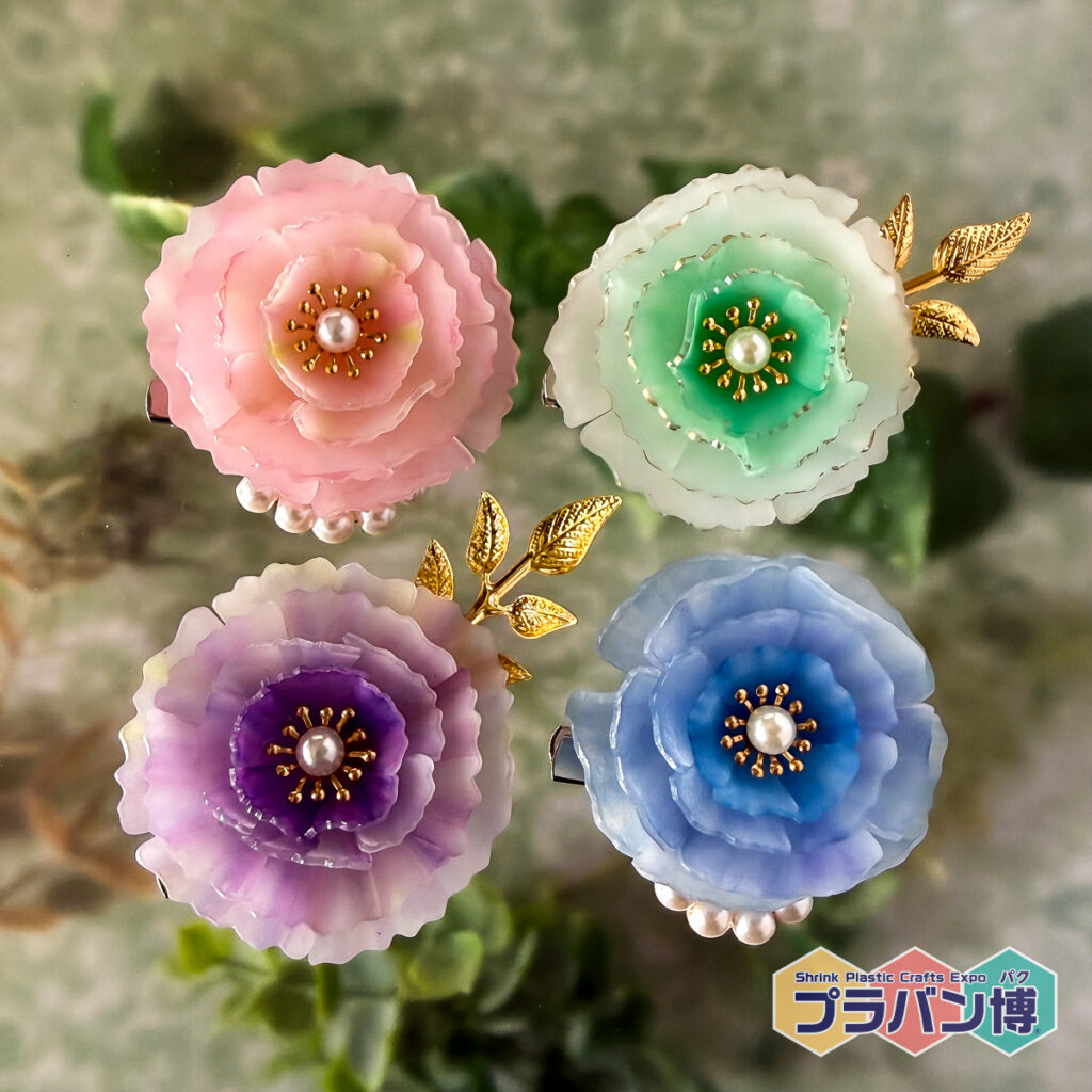 片面フロストのプラバンに油性ペンで推し色を着色し、繊細なスジ彫りを施して立体的なお花に仕上げます。