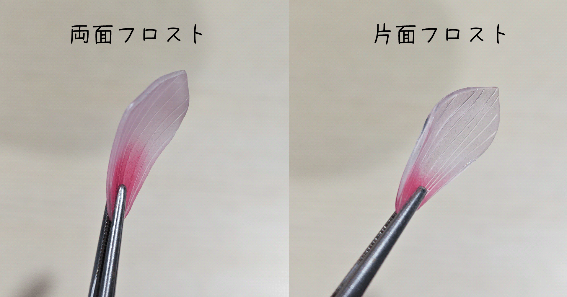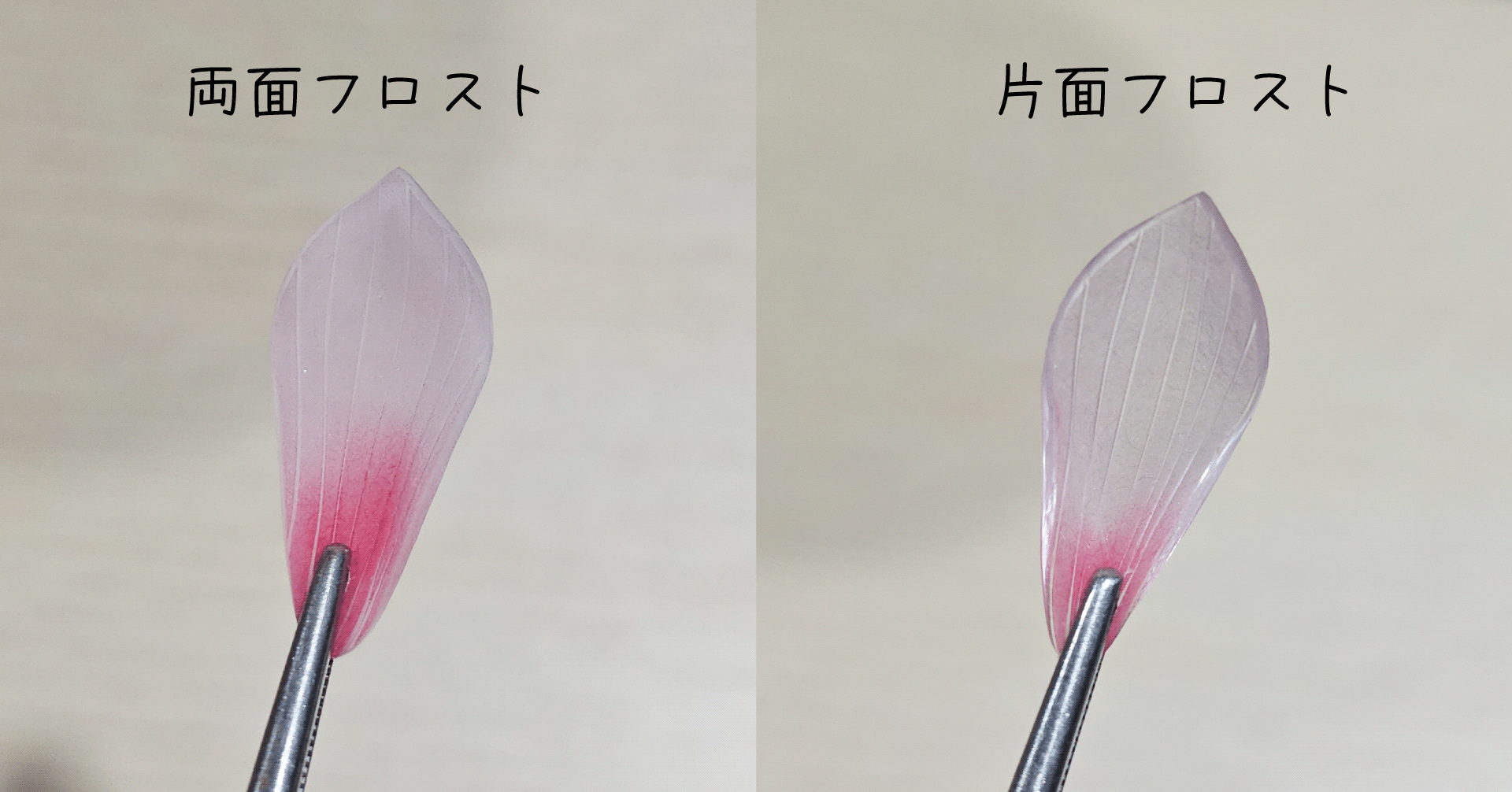 一方で両面フロストは花びらの重なりによって色が濃くなることはあまりなく、やわらかい淡い色を表現するならこちらのほうが向いているかも。